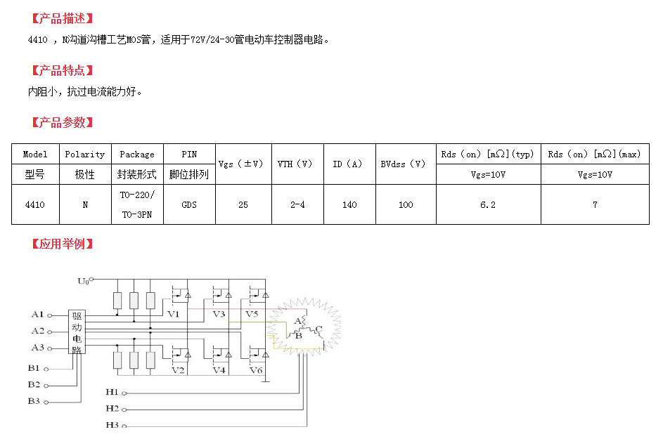 在140A、100V的大電流、低壓MOS管型中,140a100v場效應管推薦這一款純國產的4410型號來應用于電源逆變器和同步整流電路。